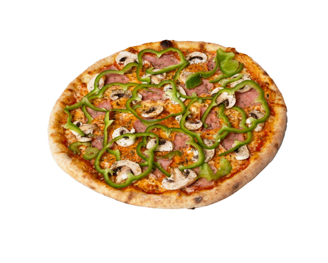tomate . mozzarella . fiambre . cogumelos frescos . pimento . oregãos