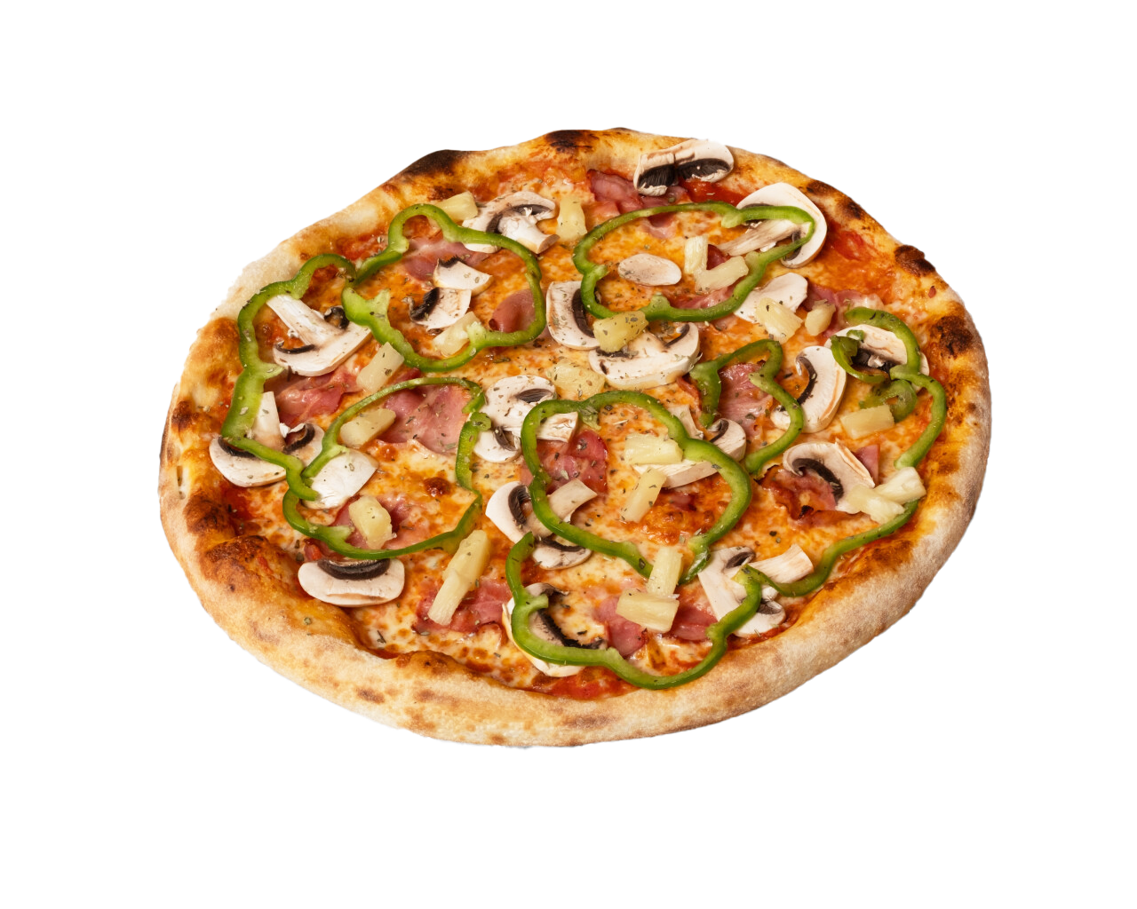 tomate . mozzarella . bacon . cogumelos frescos . pimento . ananás . oregãos