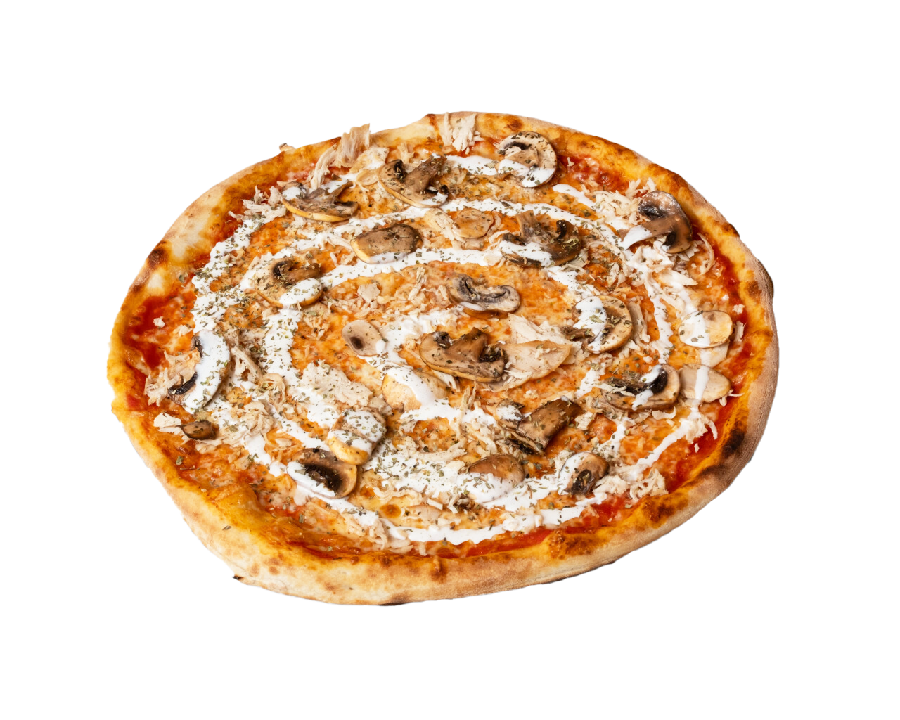tomate . mozzarella . frango . cogumelos frescos . natas . oregãos