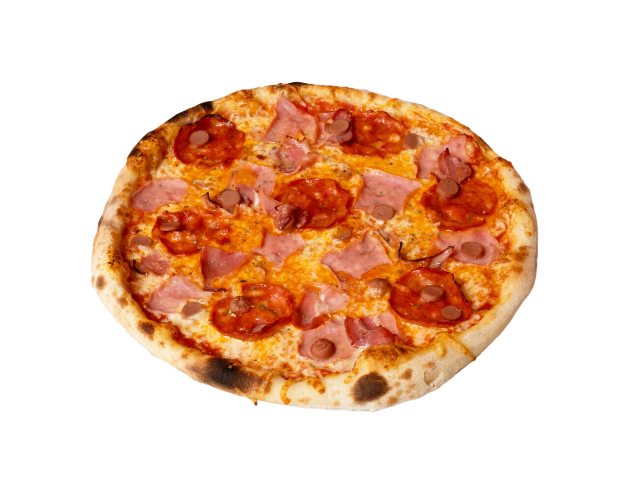 tomate . mozzarella . fiambre . chouriço . salsicha . bacon . oregãos